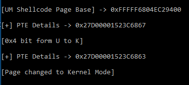 The idea is that once we control the execution flow of the kernel thread, we jump to various kernel addresses that allow us to make modifications without switching to user space. This sets the stage for executing our shellcode in UM.
