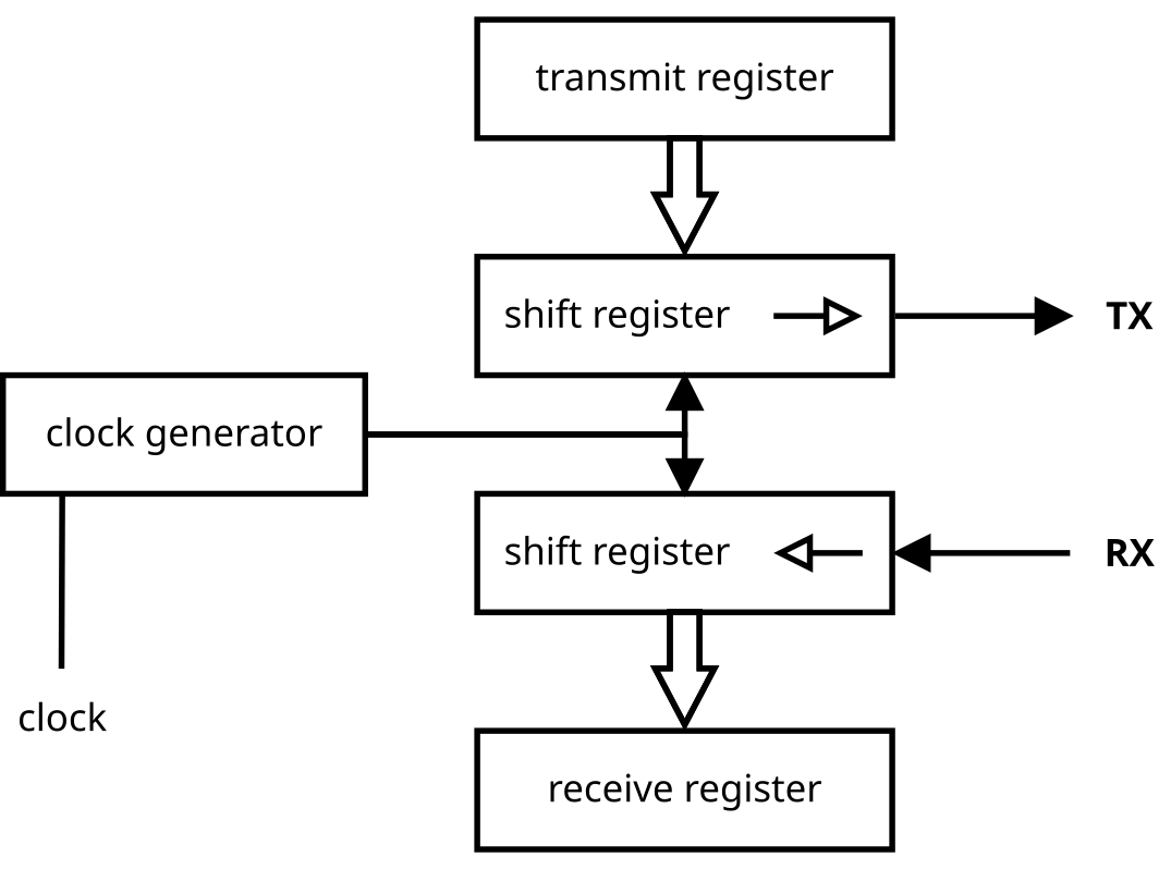UART or Universal Asynchronous Receiver (Rx) Transmitter (Tx) is a serial communication protocol between devices. It uses asynchronous communication which means there is no dedicated clock signal on the data line; instead the transmitter and receiver agree on a baud rate (9600 bps, 19200 bps, 38400 bps, 57600 bps, 115200 bps, 230400 bps, 460800 bps, 921600 bps, 1000000 bps, 1500000 bps) and synchronize from the start bit. Being serial, the bits are sent one after another over a single data line. Data can also be sent and received simultaneously.